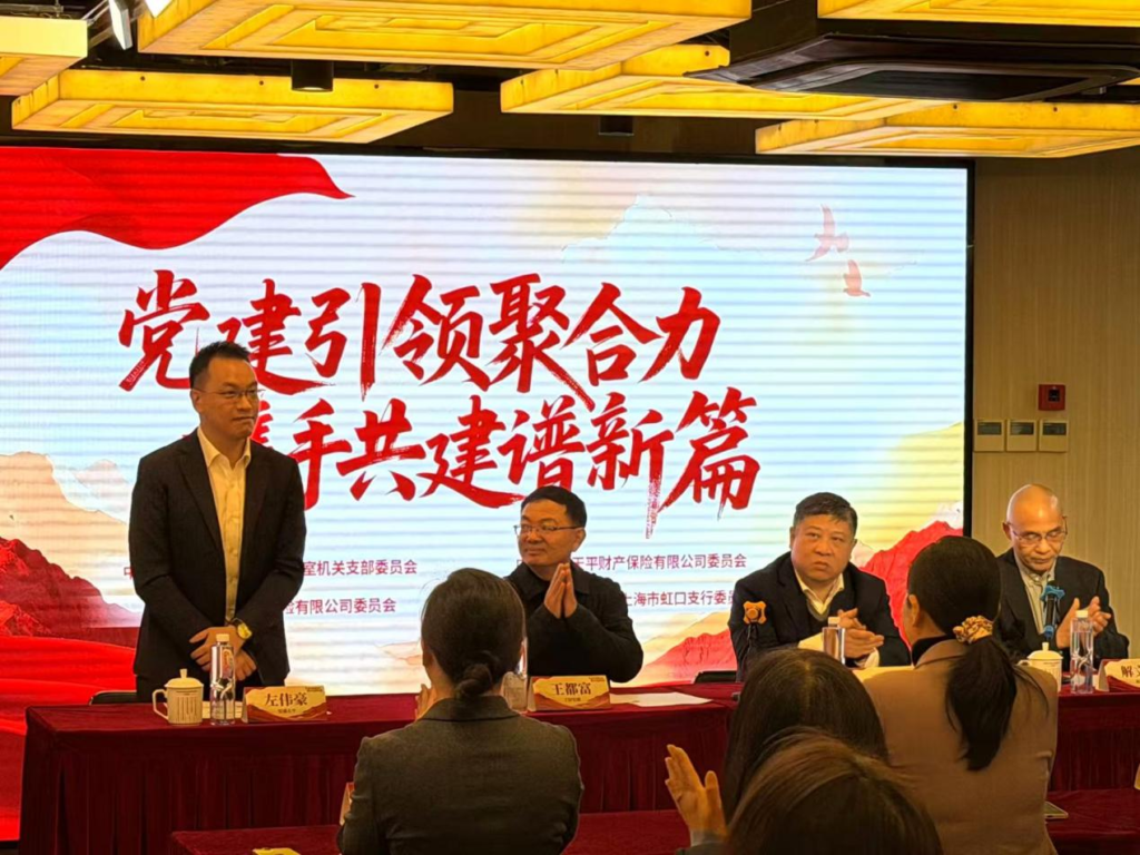 To strengthen Party building leadership, promote government-enterprise coordination, and drive high-quality development of regional finance, on the morning of December 10th, under the guidance of the Party Branch Committee of the Shanghai Hongkou District Office for the Development of the Service Industry, AXA Tianping Property & Casualty Insurance Co., Ltd., together with ICBC-AXA Life Insurance Co., Ltd., and the Industrial and Commercial Bank of China (ICBC) Hongkou Sub-branch, jointly organized a Party building (joint Party building) activity themed “Party Building Gathers Strength, Joint Efforts Write a New Chapter”. Qian Li, Secretary of the Hongkou District Party Committee, met with key guests including Kevin CHOR, CEO of AXA Tianping; Dufu Wang, Chairman of ICBC-AXA Life, and Benhong Wang, President of ICBC Hongkou Sub-branch. The two sides held in-depth discussions on strengthening government-enterprise collaboration and promoting resource sharing. Ji Li, Party Secretary and Director of the Hongkou District Office for the Development of the Service Industry, and Dai Siyuan, Chief Marketing Officer of AXA Tianping, among others, attended the meeting.
